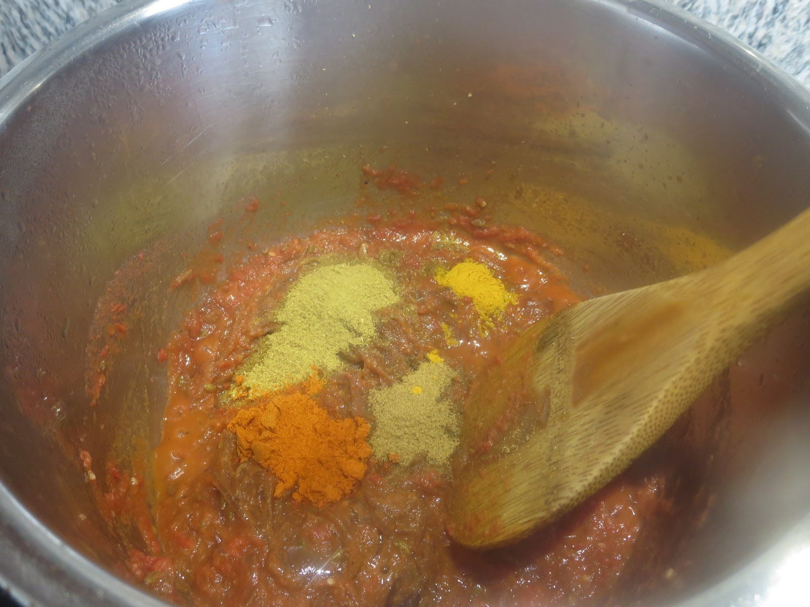 3. Add tomato puree and saute till the raw smell goes for about 2 mins.